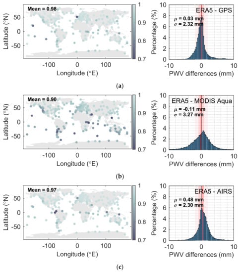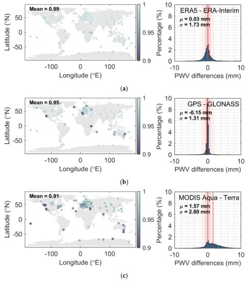 Global correlation coefficients (left) and histogram of the Precipitable Water Vapor (PWV) differences (right) of group (a) The fifth European Center for Medium-Range Weather Forecasts (ECMWF) Reprocessing (ERA5)/ECMWF Reprocessing-Interim (ERA-Interim), (b) GPS/GLONASS, and (c) Moderate Resolution Imaging Spectroradiometer (MODIS) Aqua/MODIS Terra.