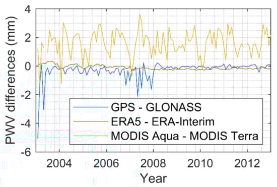 Figure 13 shows the PWV differences time series of each group. It can be seen that as time increases, differences between GPS and GLONASS become closer due to the replenishment of the GLONASS constellation and construction of more ground-based GNSS stations. The systematic bias in the ECMWF group is always extremely small, but in the last 5 years the bias in GNSS seems to be smaller than that in ECMWF. That may be due to the ECMWF reanalysis strategies. For MODIS, besides the offset, there are annual and semiannual periodic terms in their differences, which is the main reason why they have a smaller correlation coefficient than the other two groups.