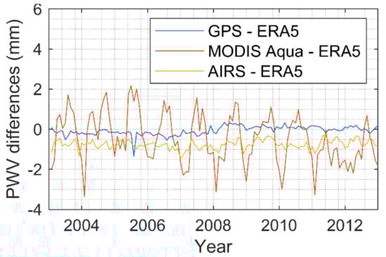 Figure 15 shows the time series of PWV differences between GPS, MODIS Aqua, AIRS, and the reference ERA5. It shows that GPS approaches ERA5 with increasing time. The systematic bias between AIRS and ERA5 is quite stable without very large variation. For MODIS Aqua, significant annual and semiannual periodic terms can be observed in their differences with ERA5, which seems to be sensor-dependent, as AIRS does not have similar periodic effects.