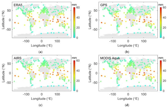Global distribution of PWV from ERA5 (a), GPS (b), AIRS (c), and MODIS Aqua (d).