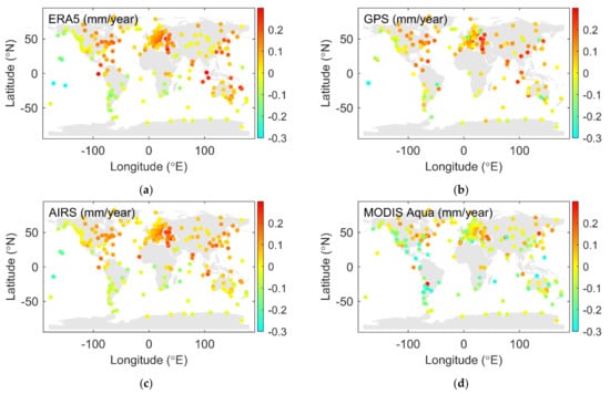 Figure 17 shows the global distribution of the PWV drift from ERA5, GPS, AIRS, and MODIS Aqua. The drifts are calculated from 2003 to 2012. The range of PWV drift is from around −0.3 mm/year to around 0.3 mm/year. It can be seen that the drift in the ERA5, GPS, and the AIRS subplot shows consistent patterns. The individual outliers in the GPS subplot are caused by measurement gaps. The drift in the MODIS Aqua subplot, however, seems to be smaller than others, in general. Furthermore, some of the positive drifts in the other three subplots are shown to be negative in the MODIS Aqua subplot. The drift of PWV is an important index for climate research. As such, calibrations are suggested for the PWVs from MODIS before their use for potential climate research.
