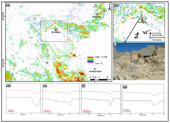 (a) Combined alteration zones from Landsat OLI, Sentinel-2, and ASTER data color coded based on intensity of hydrothermal alteration; (b) enlargement of mine areas overlain by extracted spectra showing the distribution of chlorite, kaolinite/ smectite, montmorillonite, and chalcedony as circles in black, green, blue, and white, respectively; (c) field image for the Sir Bakis gold mine; (d–g) extracted absorption spectra for chlorite (d), kaolinite/ smectite (e), montmorillonite (f), and chalcedony (g), all based on spectral signature of ASTER SWIR data. The red curves represent the extracted spectra; black curves are the USGS reference spectra.