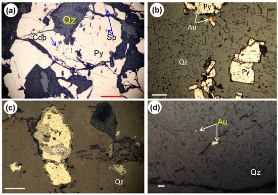Photomicrograph of mineralized quartz vein of Sir Bakis mine in reflected light (//N); (a) inclusions of chalcopyrite and sphalerite in pyrites; quartz vein (Sr#1), scale 0.3 mm; (b) gold associated with pyrite in mineralized quartz vein (scale 0.15 mm; Sr–30); (c): pyrite (py) may replace by geothite (goe) in quartz (Qz) vein, 0.2 mm; (d) gold inclusions in quartz (Sr6: 0.1 mm).