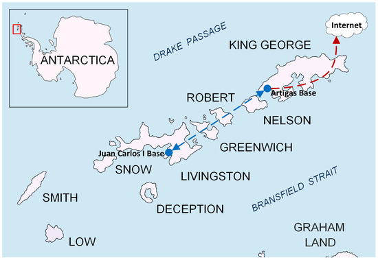 Map of the South Shetland Islands in Antarctica [10], showing the position of the WSNs (blue circles) during the test scenario of the campaign. The NVIS link is represented with the discontinuous blue line, and the Internet connectivity is represented with the discontinuous red line. The reproduction of the image was slightly modified under a Creative Commons License (CC BY-SA 3.0).