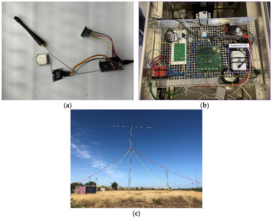 Antarctic WSN Hardware. (a) Moteino node with LoRa transceiver. (b) NVIS node with Raspberry Pi 3B+ gateway. (c) NVIS inverted vee antenna.