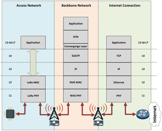 In the access network, LoRa uses a reduced protocol stack, thus avoiding layers 3 to 6 of the OSI model. The application data is directly encapsulated into the LoRa data link layer. Once data arrives at the NVIS node, the protocol stack introduces all the OSI model layers and adds the DTN layer below the application layer. The DTN layer needs a convergence layer to adapt to the transport protocol below. Figure 4 shows the EAATP as the transport protocol in the backbone network, although we test diverse transport protocols in our simulations, as discussed in Section 5. Finally, when the data arrives at the last NVIS node and must be forwarded through the Internet, the DTN and convergence layers are removed. The common, well-known TCP/IP model is used, given that end-to-end connectivity at this zone is assumed.