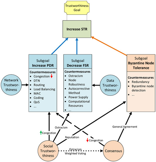 Figure 6 synthesizes our trustworthiness model actors. Blue-colored elements form part of our model baseline layers, and orange-colored elements form part of the extension layers. The primary goal is to increase the STR to provide better trustworthiness. Three main factors directly help increase the STR: (1) Mitigate/tolerate Byzantine errors; (2) decrease the FSR; and (3) increase the PDR. These factors can be seen as secondary goals that leverage the success of the final goal to provide trustworthiness. Each of these secondary goals can be accomplished by implementing a set of actions or countermeasures. Each of these countermeasures commonly affects only one of the goals. Moreover, two transversal actions impact more than one secondary goal. These transversal actions implement the extension layers of our model: the social trustworthiness layer and the consensus layer.