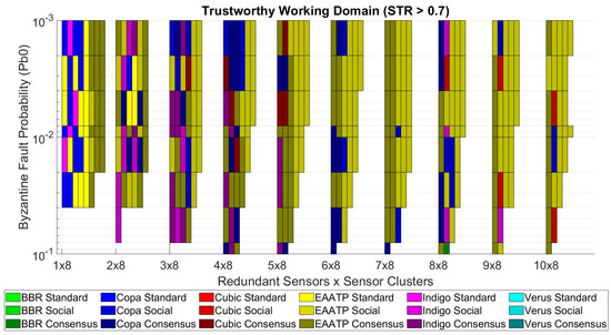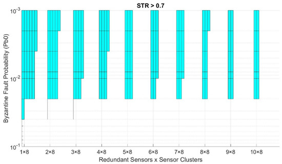 Figure 8 shows the frontal view of the trustworthiness mesh from Figure 7c. From this view, we can observe how the STR varies across the “Redundant Sensors × Sensor Clusters” axis without showing the variance, depending on the Pb0 of the nodes.