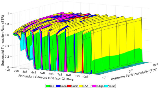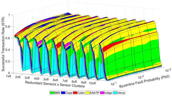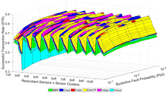 Similarly, suppose we wanted to show, in a single mesh, the results from the same scenario, but the number of redundant sensors per cluster varied between 1 and 2. In that case, we could obtain a mesh similar to Figure 7b. In this case, the “Byzantine Fault Probability” axis remains the same. In contrast, now the “Redundant Sensors × Sensor Clusters” axis has 20 discrete points, which are [1 × 2N, 2 × 2N] where N = [3, 4, …, 12]. If all the discrete points of this axis were labeled, it could be too congested. For this reason, we only label the beginning of each “redundant sensors” series, i.e., the “1 × 8” and the “2 × 8” discrete points. The same behavior as before is observed, but now the STR values recover when we jump from the “1 × 4096” to the “2 × 8” discrete point, given that much fewer nodes are introduced to the network, i.e., fewer packets are dropped due to network congestion.