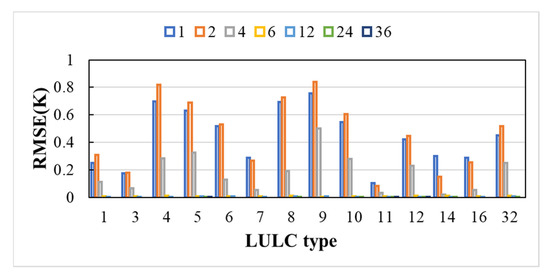 To test the effectiveness of different spin-up periods for the model, the RMSE was calculated for each simulated LST in the different cases compared with the simulated LST in the case of CMFD-48M. The differently colored bars in Figure 3 indicate different experimental cases. According to the criterion of Chen et al. [29], when the RMSE is less than 0.5 K, it can regarded that the simulation reached the quasi-equilibrium state as can be seen from Figure 3. (1) It is not the same time for different land types to reach a stable state, which agrees with the conclusion of Gao et al. [47] that the different land types in different regions need different spin-up times to make it stable. Compared with the land types of 1, 3, 7, 11, 14, and 16, the land types of 4, 5, 6, 8, 9, 10, 12, and 32 needed longer time to reach the stable state over Wuhan region. (2) When the spin-up time was 4 months (CMFD-4M), most of the land types reached the stable state, but there were still some land types that had a larger RMSE, for example, the RMSE of type 9 was larger than 0.5 K. When the spin-up time was longer than six months, the RMSE of all the land types were less than 0.5 K. Overall, the results of Figure 3 indicate that the spin-up period needs a time of 6 months at least when the u-HRLDAS are used to simulate the urban heat environment for Wuhan.