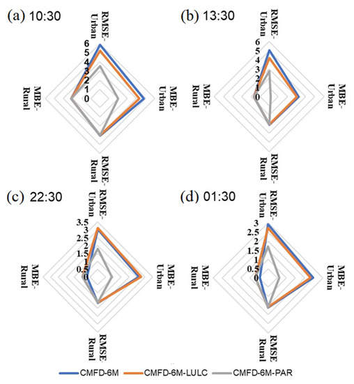 In the daytime (Figure 4a,b), after updating the land covers of 2013 in CMFD-6M-LULC, the orange line representing the CMFD-6M-LULC is located inside the blue line representing the CMFD-6M, which means the update of LULC had a positive contribution to the model simulation’s accuracy. Based on the above configuration with updated parameters in the CMFD-6M-PAR, the RMSE and MBE are represented by the gray line inside the orange line, which indicates the model simulation’s accuracy was better in the CMFD-6M-PAR than in the CMFD-6M-LULC, especially in urban regions. At nighttime (Figure 4c,d), it was obvious that the model’s simulation over urban regions in the CMFD-6M-PAR achieved the best performance than in the other two cases. Although the MBE in rural regions was lower in the CMFD-6M than in the other two cases, the indexes in these three cases were quite close in rural regions. Overall, updating the near-real-time LULC and adopting suitable parameters had a positive effect on the model simulation’s accuracy for Wuhan. The CMFD-6M-PAR showed the best performance for the above cases, and the simulation’s accuracy was significantly improved, especially for urban regions.