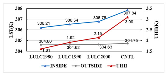The LST (Unit: K) and UHII (Unit: K) for the cases LULC1980, LULC1990, LULC2000, and CNTL. The blue line is the averaged LST inside the third ring road; the gray line shows the averaged LST outside the third ring road but within the administrative boundary; the red line represents the UHII.