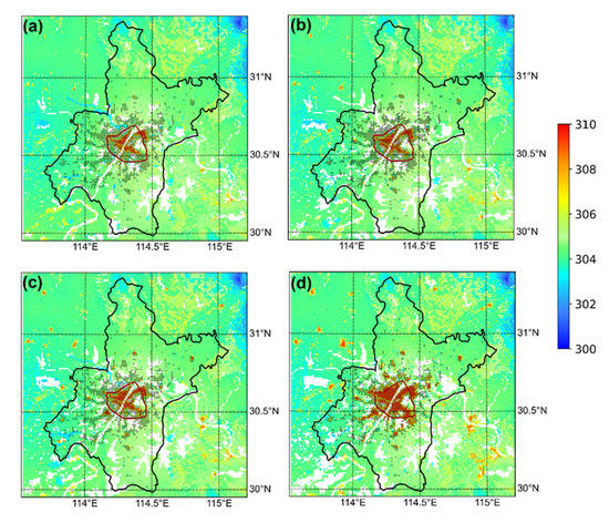 The spatial distribution of LST (Unit: K) in the case LULC1980 (a), LULC1990 (b), LULC2000 (c), and CNTL (d) averaged from 1 August to 15 August (the black point represents the urban grid in the CNTL).