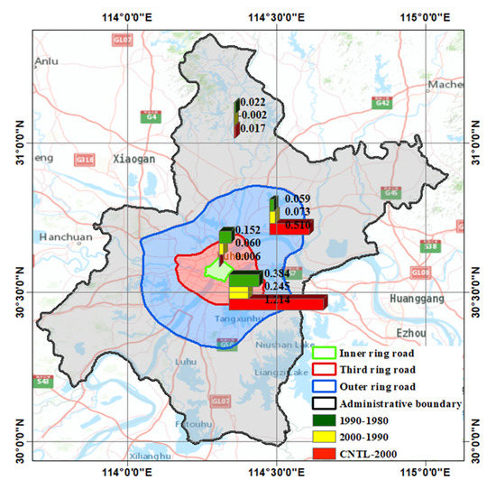 The statistics of the LST changes for each decade are shown in Figure 9. The green, yellow, and red bars represent the LST differences for LULC1990 minus LULC1980, LULC2000 minus LULC1990, and LST for the CNTL minus LULC2000, respectively. It is obvious that the quick LST response speed mainly occurs in the region inside the third ring road and outside the inner ring road. The LST_RI over this region from 2000 to 2013 was 1.214 K due to the LULC changes, while the LST_RI was 0.384 K from 1980 to 1990 and 0.245 K from 1990 to 2000. The change in LST_RI over the region outside the third ring road and within the outer ring road was also significant, especially after 2000 with the LST_RI was 0.510 K. For the region within the inner ring road and the region outside the outer ring road, the LST_RI was very small. It may be because the urban region inside the inner ring road was highly developed a long time ago. For the region outside the outer ring road, urbanization was also not as rapid as the region within the outer ring road; therefore, the change in the LST_RI of LULC was relatively small.