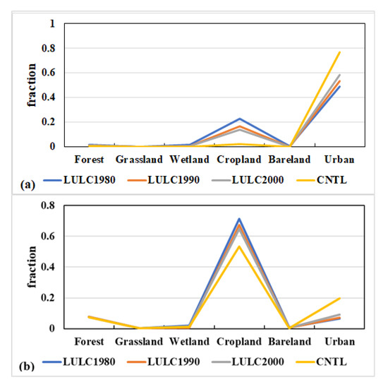 It can be concluded that the response of the urban heat environment to LULC changes was strongest after the year of 2000, especially over the region within the third ring road for Wuhan from Section 3.2. To further analyze how the changes in LULC have altered the urban heat environment of Wuhan since 1980. The fraction of each LULC type in different cases is shown in Figure 10. Because the lake effect was not considered in this study, the results are demonstrated after removing the information of lake areas. There are many LULC types expressed in the simulation shown in Figure 2; briefly, the types of 1, 5, 6, and 7 in Figure 2 were combined as the forest type here. The types 8, 9, and 10 were regarded as grassland. While the types 11, 12, and 16 are the wetland, cropland, and bare land, respectively. The urban type consisted of the types 31, 32, and 33 in Figure 2. For both the regions within the third ring road of Wuhan (Figure 10a) and outside the third ring road (Figure 10b), the main changes in the LULC type were that the cropland area decreased significantly, while the urban areas increased rapidly, especially after the year of 2000. The areas of forest, grassland, wetland, and bare land have also decreased since 1980 to present. However, compared with cropland areas, the fraction of these LULC types was small. Therefore, abundant cropland has been replaced by urban areas since 1980 to 2013 in Wuhan.