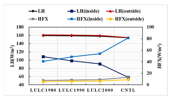 Table 5 lists the mean LST for each LULC type in different simulated cases over the whole region of Wuhan. The mean LST of wetland and cropland were lower than the mean LST over the study region for each simulation case. The LST over the urban type was higher than the mean LST for the study region in each case. Therefore, the decrease in cropland and the increase in urban areas (Figure 10) mainly caused the phenomenon that the UHI response to the LULC changes being intense since the 1980s, especially after the year 2000. To further explore the energy changes with the LULC changes, the simulated latent heat flux (LH) and sensible heat flux (HFX) averaged by the simulated results with the temporal resolution of 30 min during 1–15 August over the different statistical zones (the whole region of Wuhan, the region inside the third ring road, and the region outside the third ring road but within the administrative boundary) are shown in Figure 11. With more cropland replaced by the impervious areas, the evaporation of soil water, and the transpiration of vegetation can convert less radiation to latent heat flux; therefore, the latent heat flux decreased from 1980 to 2013, then sensible heat flux increased over both the region inside the third ring road and the region outside the third ring road (Figure 11). It can also be found that with the LULC changes, the averaged HFX (inside) increased to 81.24 W/m2 in the CNTL case, while the LH (inside) decreased to 58.19 W/m2 in the CNTL case. For the whole region of Wuhan, the averaged LH decreased 5.41 W/m2, while the HFX increased 5.59 W/m2 due to the LUCL changes from 2000–2013 and, consequently, the LST changed with the LULC changes.
