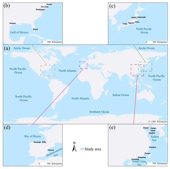 Study areas: (a) global ocean area; (b) United States of America offshore; (c) Japan offshore; (d) Spain offshore; (e) China offshore. Locations on the maps are referred to in the main text.