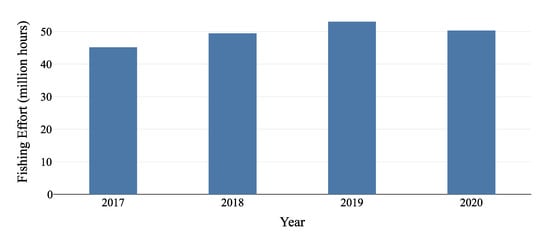 Overfishing directly affects fisheries and can cause other flow-on impacts [], such as environmental pollution, bycatch of threatened species and ecological impacts, which may undermine sustainable development of regional fisheries and marine ecosystems health. Global fishing effort is not only concentrated in the EEZs of various countries, but also in the North Pacific Ocean and South Pacific Ocean, indicating high-seas fishing is increasing for various nations.