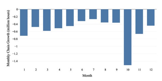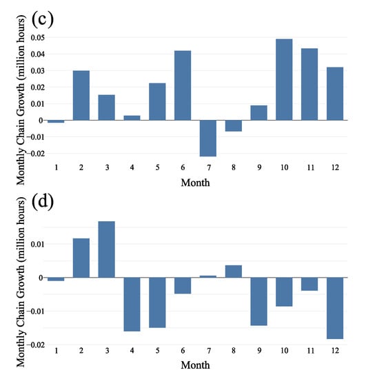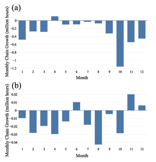 Based on the concept of deviations from month-on-month growth, monthly chain growth [] was used to determine monthly departures from an underlying linear yearly trend. Monthly changes of the target year were obtained from the monthly difference of the adjacent years before the target year. Firstly, we calculated the difference between the monthly data of each year and the previous year. Based on the results, we calculated the average of all differences except the difference between the target year and the previous year. The monthly chain growth was the difference between each month in the target year subtracted by the average difference between months in previous years. A positive number represents increasing departures from the trend, and a negative number represents decreasing departures, as calculated by Equation (1) below: