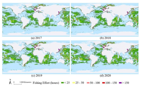 Global fishing effort for 0.1° grids (Table 1 and bearing in mind the lack of small-scale fishing data) showed the percentage of grids fished increased yearly (2017–2019), and on average occurred within 25.67% of ocean grids (2017–2020), mostly from central Atlantic and eastern Pacific. However, the proportion of grids fished increased to 27.49% in 2020, despite the overall decline of effort noted in Figure 2, implying that fishing was more widespread but less intense.