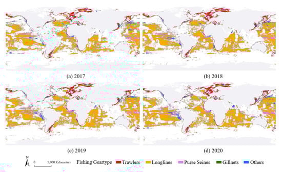 Spatial distribution of global fishing gear from 2017 to 2020.