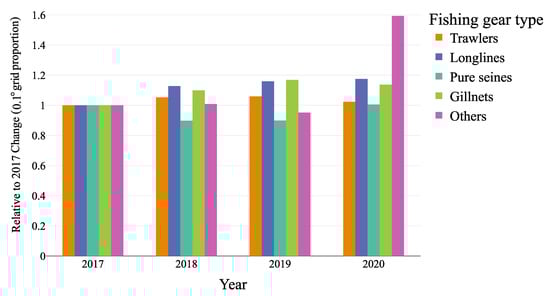 Yearly variation from 2017–2020 of the ratio of global grid counts by fishing gear type relative to 2017.
