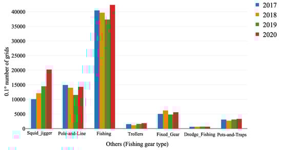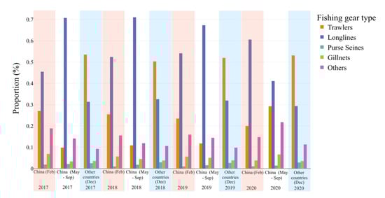 The proportion of trawlers and longlines in the annual fishery increased slightly each year (2017–2019), which is possibly related to overfishing policy restrictions on inshore fishery resources of some countries. However, in 2020, compared to the previous three years, the proportion of trawlers in 2020 declined the most, and Other fishing gears generally increased, specifically the Other category. The increase in Other gear was primarily associated with increases in squid jigger, pole-and-line and unknown fishing gear types (Figure 7).