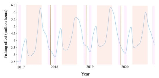 Global monthly fishing effort (millions of hours) from 2017 to 2020. The pink area is the cultural month of New Year and Christmas, and the orange area is China’s fishing closed season.