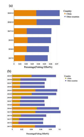 China’s fishing closed season was mainly concentrated in the EEZ, with the greatest impact in May and September. The average proportion of fishing effort of other countries during this period was about 25.44% and stable. As shown in Figure 9, although the proportion of fishing effort of Chinese fishing vessels decreased during China’s fishing closed season in 2018, the overall fishing effort was still higher than 2017. Thus, the fishing effort of other countries during this period increased significantly compared to 2017.