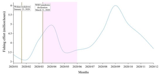 In 2020, lockdown in several countries caused by the novel coronavirus (COVID-19) pandemic impacted global fishing effort. As shown in Figure 11, the fishing effort curve in 2020 was similar to previous years (2017–2019; (Figure 8)), but fishing effort decreased sharply every month. Prior to the lockdown in various countries, the fishing effort in January was lower than previous years. The world’s first lockdown was imposed in Wuhan, China, on 23 January 2020, while China officially entered its national lockdown phase after the Chinese New Year. The global fishing effort in February and March increased slowly due to the impact of the lockdown. The World Health Organization (WHO) declared the COVID-19 lockdown a global emergency on March 11, and most countries announced their policies and entered their March–May first lockdown phase. The fishing effort trend was similar to previous years, but the decline was rapid, and extreme values were lower than those in 2019. Although the second lockdown was implemented in some countries after June 2020 and had an impact on the fishing effort, the timing was not uniform, and the temporal scale was less than the monthly scale we studied.