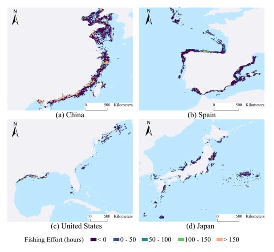 AIS fishing effort (Figure 4) was consistent with the findings of FAO [], with most areas experiencing 0–50 h of effort and most effort in the high seas outside the Exclusive Economic Zone (EEZ) of coastal states. Data for small-scale fisheries in Southeast Asia were noticeably missing (due to a lack of AIS data for vessels under 15 m length) and this is a key limitation of our study. High fishing effort was mostly located along coastal areas of European countries, offshore areas of China and parts of the Pacific Ocean high seas. Coastal effort was banded or block-like, and annual effort in 0.1° grids was 100 h or more.