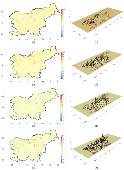 where μ and λ are non-dimensional coefficients taken from [21]. A radius of 166.7 km was taken into account [25], as this is based on a sphere shaped Earth with a radius of 6371 km; G (gravitational constant) = 6.673 ± 0.01 × 1−11 m3 kg−1 s−2. This constant is a recently adopted value and differs from the value given in the GRS80 ellipsoid. h represents the reference height of the point. In the equation, the corrections are given in the unit m/s2, which is then transformed into [mGal] by multiplying it by 105, while ρ—the average Earth density—is 2670 kg/m3 [13]. Figure 7a depicts the calculated corrections for Slovenia, while the statistical indicators can be found in Table 2.