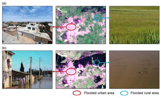Comparison of radar return change between flooded urban areas and flooded rural areas. Sentinel-1 SAR images acquired (a) before and (b) during flooding. The RGB composition of the Sentinel-1 images is formed with VV (red), VH (green), and VV (blue).