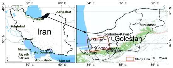 The study area is located in the southwest of the Golestan province, Iran (Figure 2). The climate in Golestan is influenced by the Albertz Mountains, Caspian Sea, northern desert, and forests, which result in significant differences in rainfall among the different regions of the Golestan province [29]. The annual precipitation in Golestan is between 700–1000 mm, which is mainly concentrated in October [30]. The rainfall in the south and west regions is higher than that in the north and east [16]. Furthermore, there are several seasonal rivers, among which the Gorganrood river is the most extended [16], traveling through cities including Aqqala, Siminshahr, Gonbadkavoos, and Bandartorkman.