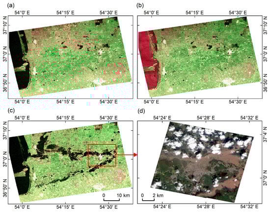 Sentinel-1 PolSAR images acquired on (a) 5 March 2019, (b) 17 March 2019, and (c) 29 March 2019, respectively, and (d) a Jilin-1 high-resolution optical image collected on 29 March 2019 (Note: the RGB composition of the Sentinel-1 PolSAR images is formed with VV (red), VH (green), and VV + VH (blue)).