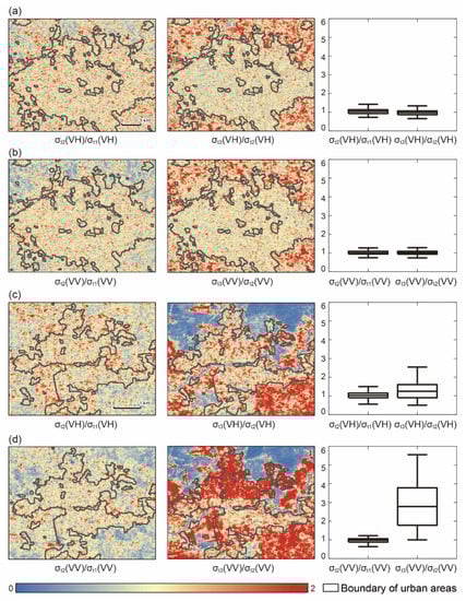 Figure 7a,b demonstrate the backscattering coefficient variation in unflooded urban areas under VH and VV polarization, respectively. Figure 7c,d illustrate the backscattering coefficient variation in flooded urban areas under VH and VV polarization, respectively. The subfigures in the first column in Figure 7 show the backscattering coefficient ratio of the second image to the first image (i.e., backscattering coefficient variation without the effect of flooding), and those in the second column show the backscattering coefficient ratio of the third image to the second image (i.e., the backscattering coefficient change under the effect of flooding). Thus, the backscattering coefficient change caused by the flooding can be clearly revealed and confirmed by comparing the first and second columns in Figure 7. As shown in Figure 7a,b, the backscattering coefficient changed little in unflooded urban areas under VH and VV polarizations. In contrast, Figure 7c,d indicated a notable change in backscattering coefficient in flooded urban areas under VH and VV polarizations. Moreover, VV polarization was more sensitive to the change than VH polarization.