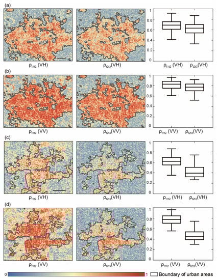 High-precision image co-registration is essential for estimating the interferometric coherence. In this study, a precise orbit file with accurate satellite position and velocity information was employed for the co-registration of PolSAR images. Interferometric coherence between the first and second images and that between the second and third images were calculated according to Equation (1), wherein a 7 × 7 window was used to calculate the interferometric coherences. Figure 8 shows the variation in interferometric coherence under different polarizations in unflooded and flooded urban areas. The subfigures in the first column of Figure 8 are the interferometric coherence between the first and second images, and those in the second column are the interferometric coherence between the second and third images. Figure 8a,b reveal the interferometric coherence variation in unflooded urban areas under VH and VV polarizations, respectively. Figure 8c,d show the interferometric coherence variation in flooded urban areas under VH and VV polarizations, respectively. As shown in Figure 8a,b, the interferometric coherence changed little in unflooded urban areas under VV and VH polarizations. In contrast, the comparison of Figure 8c with Figure 8d reveals a notable interferometric coherence decrease (ICD) under VV and VH polarizations. The ICD under VV polarization was more significant than that under VH polarization.