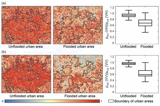 The ratio between the interferometric coherence extracted from the second and third images and that from the first and second images were calculated for different polarizations. As shown in Figure 9, the interferometric coherence ratios in unflooded urban areas were approximately 0.91 and 0.94 under VH and VV polarization, respectively, while those in flooded urban areas were approximately 0.67 and 0.59, respectively. These findings confirm that the interferometric coherence in urban areas varied little without the effect of flooding but decreased significantly when the urban areas were inundated, especially under VV polarization.