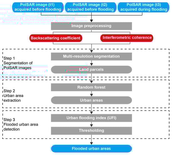 A UFI was proposed for the unsupervised detection of inundated urban regions. The UFI-based method mainly consisted of three steps (Figure 10): First, the multi-temporal PolSAR images were segmented together using the multi-resolution segmentation technique to delineate land parcels. Second, urban areas were extracted from the SAR images acquired before the flooding by using an object-based random forest algorithm. Third, the UFI was calculated with the BCI and ICD caused by the urban flooding, and the flooded urban areas were detected by implementing thresholding methods on the UFI.