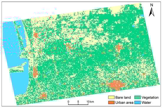 It is necessary to ensure that the urban area map excludes false alarms (e.g., inundated trees or crops) from the detection results of flooded urban areas. Herein, an object-based random forest (RF) [42] was employed to produce a pre-flooding land cover map based on the backscattering coefficients and interferometric coherences extracted from the two images acquired before the flooding. Combining the backscattering coefficients and interferometric coherences could improve the land cover classification accuracy, especially for urban areas [40]. The features used for this object-based classification included the mean layer value, standard deviation, skewness of the backscattering coefficients, and interferometric coherences under VH and VV polarizations. The final land cover classification result is shown in Figure 12. The overall accuracy and Kappa coefficient of the classification were 93.35% and 0.91, respectively. The producer’s and user’s accuracies for urban areas were 93.93% and 95.17%, respectively.