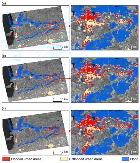 Flooded urban areas detected using the (a) UFI-based, (b) ICD-based, and (c) FBI-based methods.