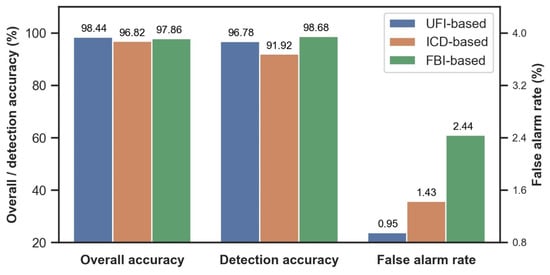 Accuracy statistics of the UFI-, ICD-, and FBI-based methods for flooded urban area detection.