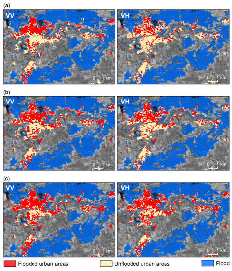 Flooded urban areas were detected using the UFI-based method (Figure 14). Inundated rural areas (e.g., inundated bare land and short vegetation) were also detected using the image ratioing method proposed by [43]. Given that VH polarization is less affected than VV polarization by wind [44], it was used in image ratioing to detect inundated rural areas. These images which include the inundated flooded rural areas could facilitate the observation of the detected inundated urban areas. Three statistics were calculated for the accuracy assessment on the flooded urban area detection, including the detection accuracy, false alarm rate, and overall accuracy. The detection accuracy is the percentage of correctly labeled flooded urban samples, and the false alarm rate denotes the percentage of mistakenly labeled unflooded urban samples. The overall accuracy is the percentage of correctly labeled verification samples (i.e., flooded and unflooded samples). The overall accuracy, detection accuracy, and false alarm rate attained by the UFI-based method were 96.93%, 91.09%, 0.95%, respectively.