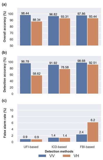 Accuracy improvement achieved by the VV polarization in comparison with VH polarization. (a) overall accuracy, (b) detection accuracy, (c) false alarm rate.