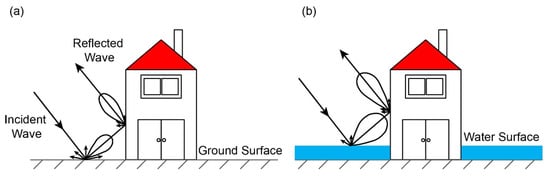 Our investigation showed that VV polarization exhibits a stronger increase in radar return from flooded urban areas than VH. When urban areas were flooded, buildings were partially submerged by water. Thus, the original dihedral structure between the buildings and the ground was replaced by a new dihedral structure between the buildings and the water. Compared with the materials (e.g., such as asphalt, cement, and soil) that constitute roads, streets, and squares, water typically features a higher dielectric constant and smoother surface [18], which could result in an increase in the radar power reflected from the water surface to the buildings (Figure 19). Consequently, the radar backscatter from built-up areas was enhanced (Figure 19). Moreover, double-bounce scattering dominated the radar backscatter from urban areas because of numerous human-made dihedral structures [45,46]. Therefore, the BCI under VV polarization was more significant than that under VH polarization.