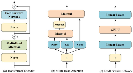 Structure of the transformer encoder. (a) The transformer encoder mainly consists of a multi-head attention module, a feedforward network (FFN), and two residual connections. (b) The multi-head attention first projects the input x into three vectors of the same shape, which are called the query, key, and value. The module then calculates the similarity coefficients between the query and the key vector. The similarity values are used as attention scores. The attention scores are further used to calculate the weighted sum of the value vector. (c) The FFN expands the input x into a higher dim and squeezes it back using an MLP. A nonlinear layer such as GELU [58] is inserted between the two fully connected layers.