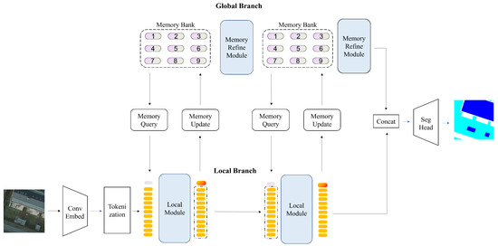 The proposed model for remote sensing segmentation. The MAT mainly consists of a global branch and a local branch. The global branch refines the memory bank, which is used as a representation of the prior and global information. The local branch extracts features from the input images. Bidirectional information flow between the two branches is enforced by the memory-query and memory-update modules. Then, the two branches’ output representation is fed into the segmentation head to perform segmentation prediction.