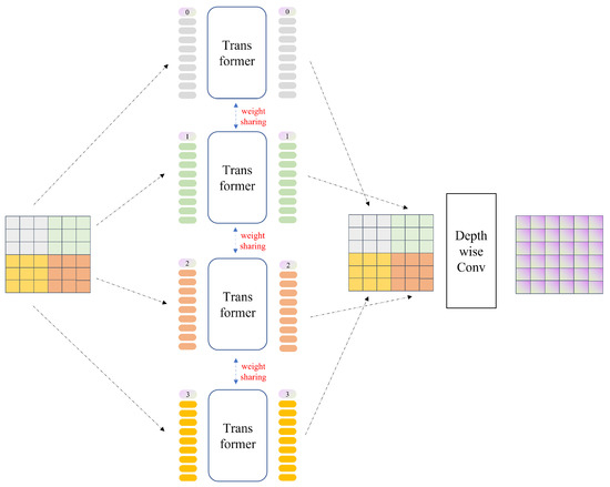The local aggregation module (Figure 5) consists of a transformer encoder and a depthwise convolution layer. The transformer encoder is used as the hybrid feature extraction module, which extracts features from the concatenated memory token and the local area features. The global receptive field of the transformer enables feature interaction between local image features and between the memory token and image features. For the image module, we adopted a single-layer depthwise convolution. The depthwise convolution was used to align the features concerning the edge point of patches and enforce some relative position information into the MAT since the transformer encoder is position invariant.