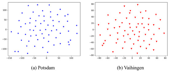The T-SNE results of the learned prior on both datasets are shown in Figure 7. The visualization results showed that these tokens tended to learn different memory prior information concerning their locations. Moreover, the ablation study in Table 3 confirmed that the memory prior could obtain a mIoU gain and a average F1-score gain on the Potsdam dataset, while it could obtain a mIoU gain and a average F1-score gain on the Vaihingen dataset.