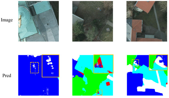 For training, the images were first randomly cropped into . Such a cropping strategy resulted in a total of 12,000 training examples for ISPRS Potsdam and 8000 training examples for ISPRS Vaihingen. For the Potsdam images, we performed a random vertical flip, horizontal flip, and 90 rotation to the input image with a probability of 0.5. Then, we normalized the augmented image with a mean of (0.5, 0.5, 0.5) and an std of (1.0, 1.0, 1.0). For the Vaihingen images, we added the cutmix [62] and mixup [63] strategy and a random scale of [0.5, 2.0] due to the limited images.